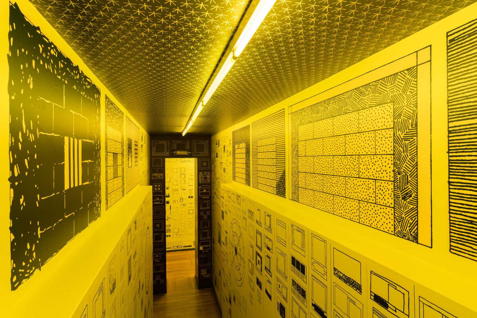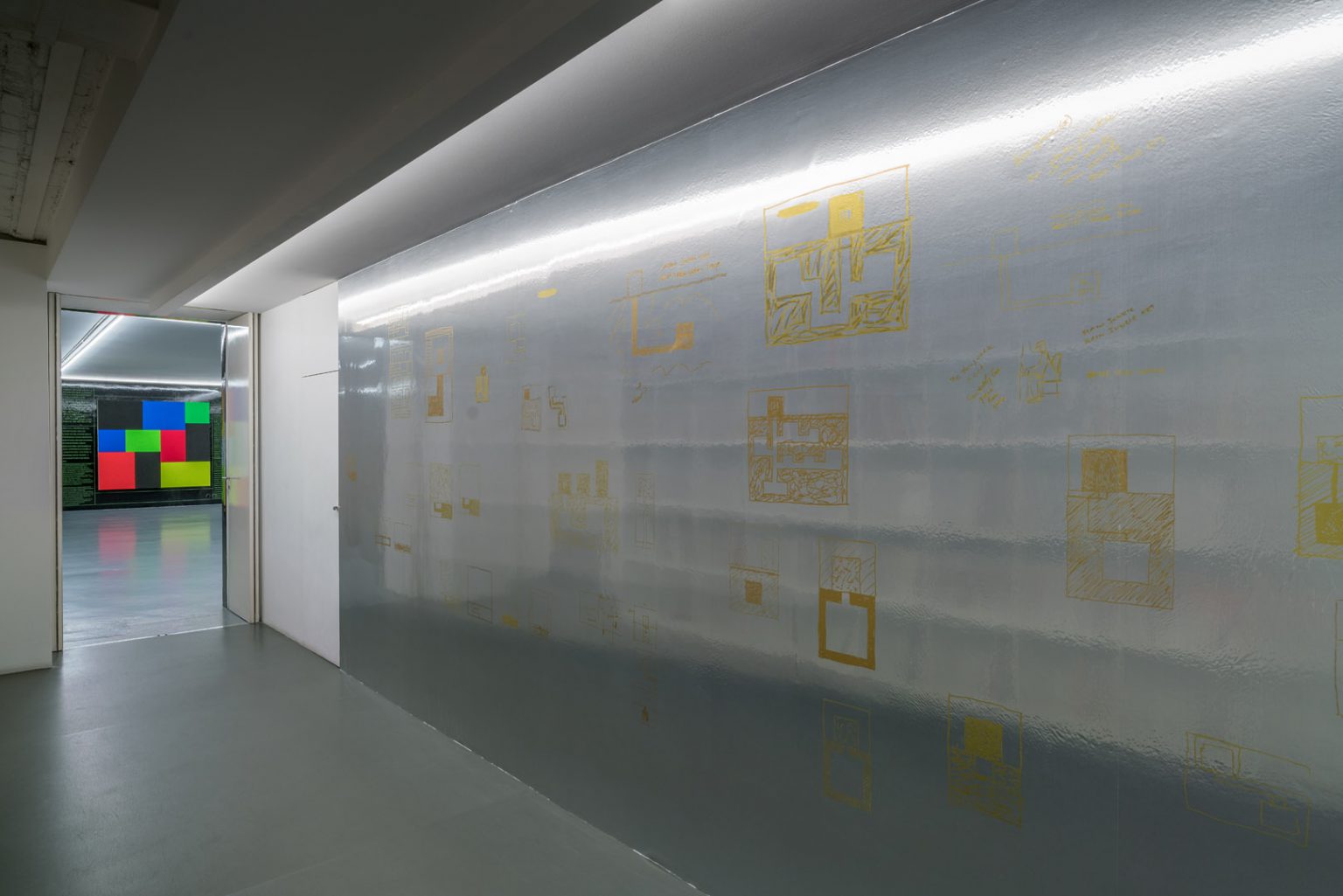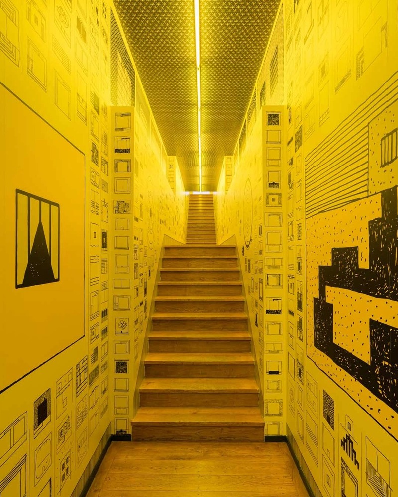 In the stairwell, the entrance, and the corridors, a set of printed drawings highlighted the specific architectural features of the gallery, creating effects of thresholds and passages.